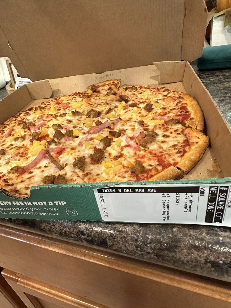 Get a taste of the tropics. This super delicious pizza is loaded with sweet, juicy pineapple tidbits, julienne-cut Canadian bacon, hickory-smoked bacon, a three-cheese blend, and real cheese made from mozzarella on our signature sauce and original fresh dough.
